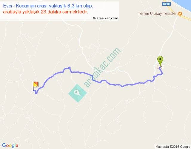 Evci - Kocaman arası yaklaşık olarak 90 km/h ile yukarıda belirtilen sürede olup, iki yerin kuş uçuşu uzaklığı (mesafesi) 6'dir. Yolculuk otobüsle 29 dakika sürmektedir.
