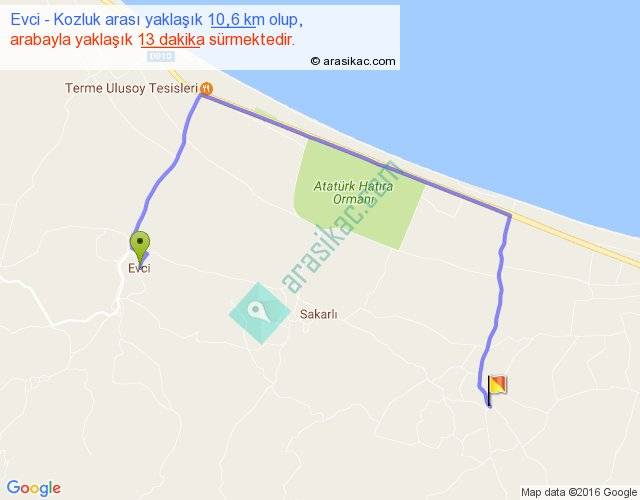 Evci - Kozluk arası yaklaşık olarak 90 km/h ile yukarıda belirtilen sürede olup, iki yerin kuş uçuşu uzaklığı (mesafesi) 5'dir. Yolculuk otobüsle 16 dakika sürmektedir.
