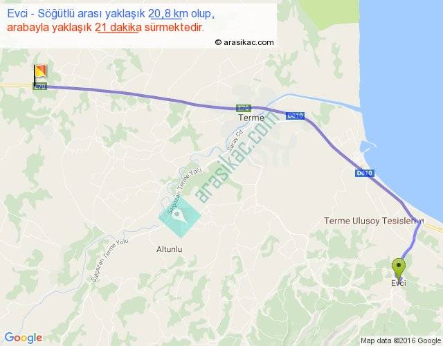 Evci - Söğütlü arası yaklaşık olarak 90 km/h ile yukarıda belirtilen sürede olup, iki yerin kuş uçuşu uzaklığı (mesafesi) 17'dir. Yolculuk otobüsle 27 dakika sürmektedir.