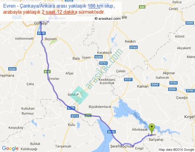 Evren - Çankaya Ankara arası yaklaşık olarak 90 km/h ile yukarıda belirtilen sürede olup, iki yerin kuş uçuşu uzaklığı (mesafesi) 118'dir. Yolculuk otobüsle 2 saat 51 dakika sürmektedir.