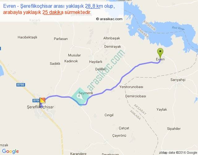 Evren - Şereflikoçhisar arası yaklaşık olarak 90 km/h ile yukarıda belirtilen sürede olup, iki yerin kuş uçuşu uzaklığı (mesafesi) 25'dir. Yolculuk otobüsle 32 dakika sürmektedir.