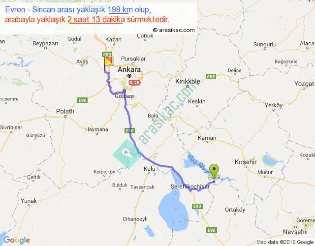 Evren - Sincan arası yaklaşık olarak 90 km/h ile yukarıda belirtilen sürede olup, iki yerin kuş uçuşu uzaklığı (mesafesi) 148'dir. Yolculuk otobüsle 2 saat 52 dakika sürmektedir.