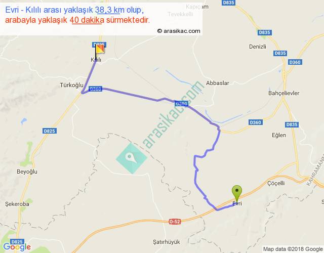 Evri - Kılılı arası yaklaşık olarak 90 km/h ile yukarıda belirtilen sürede olup, iki yerin kuş uçuşu uzaklığı (mesafesi) 24'dir. Yolculuk otobüsle 52 dakika sürmektedir.
