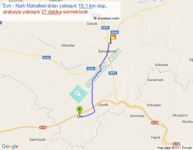 Evri - Narlı Mahallesi arası yaklaşık olarak 90 km/h ile yukarıda belirtilen sürede olup, iki yerin kuş uçuşu uzaklığı (mesafesi) 16'dir. Yolculuk otobüsle 35 dakika sürmektedir.