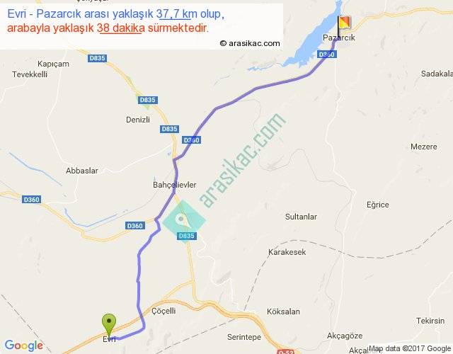 Evri - Pazarcık arası yaklaşık olarak 90 km/h ile yukarıda belirtilen sürede olup, iki yerin kuş uçuşu uzaklığı (mesafesi) 32'dir. Yolculuk otobüsle 49 dakika sürmektedir.