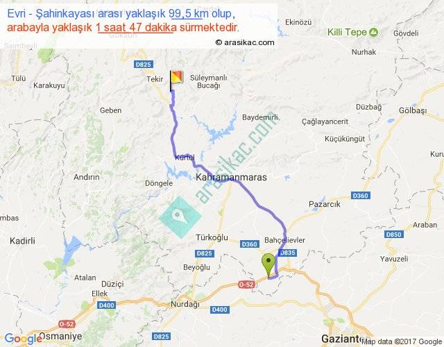 Evri - Şahinkayası arası yaklaşık olarak 90 km/h ile yukarıda belirtilen sürede olup, iki yerin kuş uçuşu uzaklığı (mesafesi) 73'dir. Yolculuk otobüsle 2 saat 19 dakika sürmektedir.