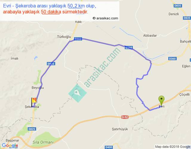 Evri - Şekeroba arası yaklaşık olarak 90 km/h ile yukarıda belirtilen sürede olup, iki yerin kuş uçuşu uzaklığı (mesafesi) 26'dir. Yolculuk otobüsle 1 saat 5 dakika sürmektedir.
