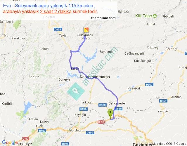 Evri - Süleymanlı arası yaklaşık olarak 90 km/h ile yukarıda belirtilen sürede olup, iki yerin kuş uçuşu uzaklığı (mesafesi) 72'dir. Yolculuk otobüsle 2 saat 38 dakika sürmektedir.