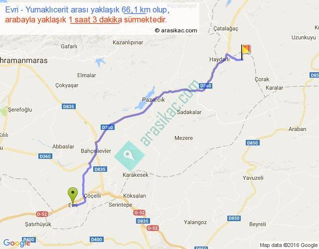 Evri - Yumaklıcerit arası yaklaşık olarak 90 km/h ile yukarıda belirtilen sürede olup, iki yerin kuş uçuşu uzaklığı (mesafesi) 54'dir. Yolculuk otobüsle 1 saat 21 dakika sürmektedir.