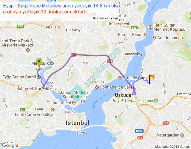 Eyüp - Kirazlıtepe Mahallesi arası yaklaşık olarak 90 km/h ile yukarıda belirtilen sürede olup, iki yerin kuş uçuşu uzaklığı (mesafesi) 11'dir. Yolculuk otobüsle 39 dakika sürmektedir.