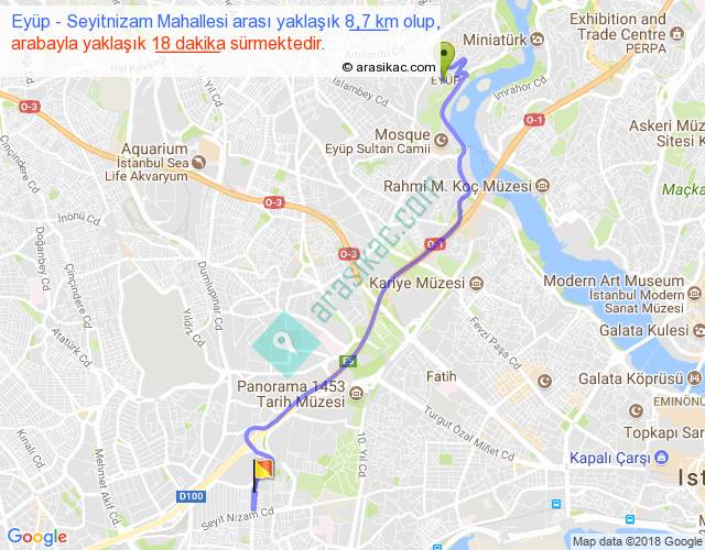 Eyüp - Seyitnizam Mahallesi arası yaklaşık olarak 90 km/h ile yukarıda belirtilen sürede olup, iki yerin kuş uçuşu uzaklığı (mesafesi) 6'dir. Yolculuk otobüsle 23 dakika sürmektedir.