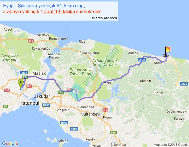 Eyüp - Şile arası yaklaşık olarak 90 km/h ile yukarıda belirtilen sürede olup, iki yerin kuş uçuşu uzaklığı (mesafesi) 58'dir. Yolculuk otobüsle 1 saat 34 dakika sürmektedir.