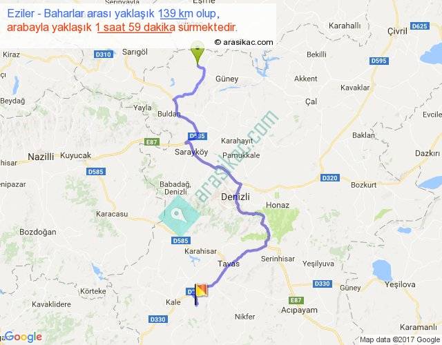 Eziler - Baharlar arası yaklaşık olarak 90 km/h ile yukarıda belirtilen sürede olup, iki yerin kuş uçuşu uzaklığı (mesafesi) 83'dir. Yolculuk otobüsle 2 saat 34 dakika sürmektedir.
