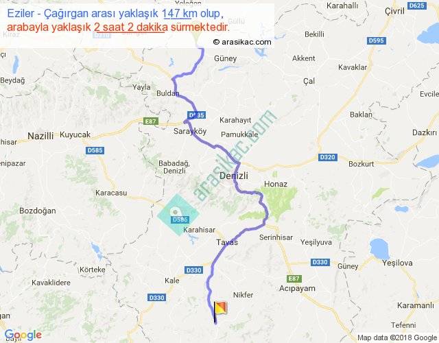 Eziler - Çağırgan arası yaklaşık olarak 90 km/h ile yukarıda belirtilen sürede olup, iki yerin kuş uçuşu uzaklığı (mesafesi) 97'dir. Yolculuk otobüsle 2 saat 38 dakika sürmektedir.