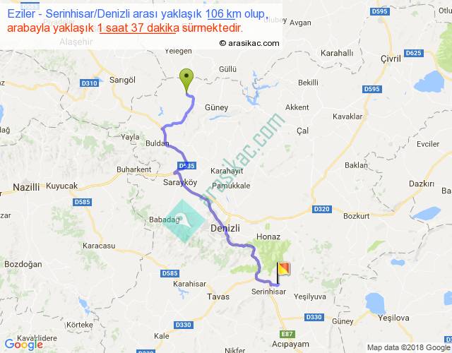 Eziler - Serinhisar Denizli arası yaklaşık olarak 90 km/h ile yukarıda belirtilen sürede olup, iki yerin kuş uçuşu uzaklığı (mesafesi) 72'dir. Yolculuk otobüsle 2 saat 6 dakika sürmektedir.