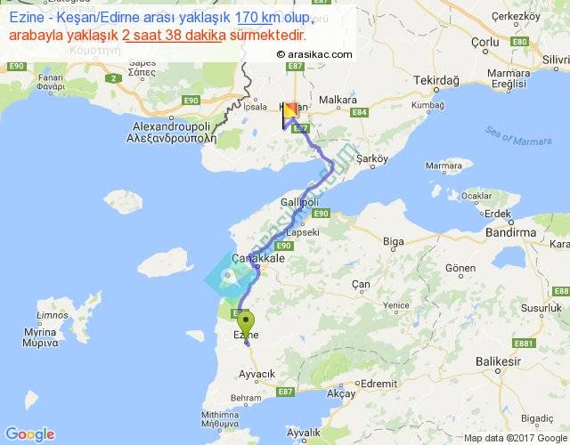 Ezine - Keşan Edirne arası yaklaşık olarak 90 km/h ile yukarıda belirtilen sürede olup, iki yerin kuş uçuşu uzaklığı (mesafesi) 113'dir. Yolculuk otobüsle 3 saat 25 dakika sürmektedir.