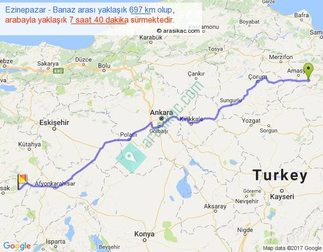 Ezinepazar - Banaz arası yaklaşık olarak 90 km/h ile yukarıda belirtilen sürede olup, iki yerin kuş uçuşu uzaklığı (mesafesi) 573'dir. Eğer belirtilen yerler arasında uçak seferi var ise bu süre uçakla 52 dakika'ya kadar düşebilir. Yolculuk otobüsle 9 saat 58 dakika sürmektedir.