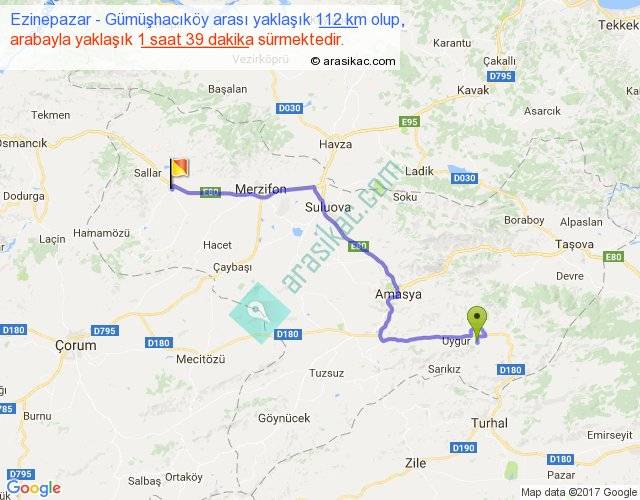 Ezinepazar - Gümüşhacıköy arası yaklaşık olarak 90 km/h ile yukarıda belirtilen sürede olup, iki yerin kuş uçuşu uzaklığı (mesafesi) 79'dir. Yolculuk otobüsle 2 saat 8 dakika sürmektedir.