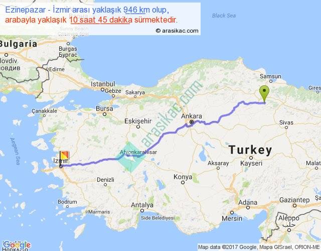 Ezinepazar - İzmir arası yaklaşık olarak 90 km/h ile yukarıda belirtilen sürede olup, iki yerin kuş uçuşu uzaklığı (mesafesi) 796'dir. Eğer belirtilen yerler arasında uçak seferi var ise bu süre uçakla 1 saat 13 dakika'ya kadar düşebilir. Yolculuk otobüsle 13 saat 58 dakika sürmektedir.