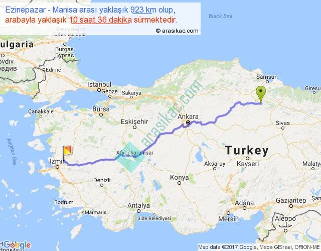 Ezinepazar - Manisa arası yaklaşık olarak 90 km/h ile yukarıda belirtilen sürede olup, iki yerin kuş uçuşu uzaklığı (mesafesi) 765'dir. Eğer belirtilen yerler arasında uçak seferi var ise bu süre uçakla 1 saat 10 dakika'ya kadar düşebilir. Yolculuk otobüsle 13 saat 46 dakika sürmektedir.