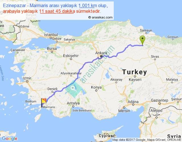Ezinepazar - Marmaris arası yaklaşık olarak 90 km/h ile yukarıda belirtilen sürede olup, iki yerin kuş uçuşu uzaklığı (mesafesi) 786'dir. Eğer belirtilen yerler arasında uçak seferi var ise bu süre uçakla 1 saat 12 dakika'ya kadar düşebilir. Yolculuk otobüsle 15 saat 16 dakika sürmektedir.