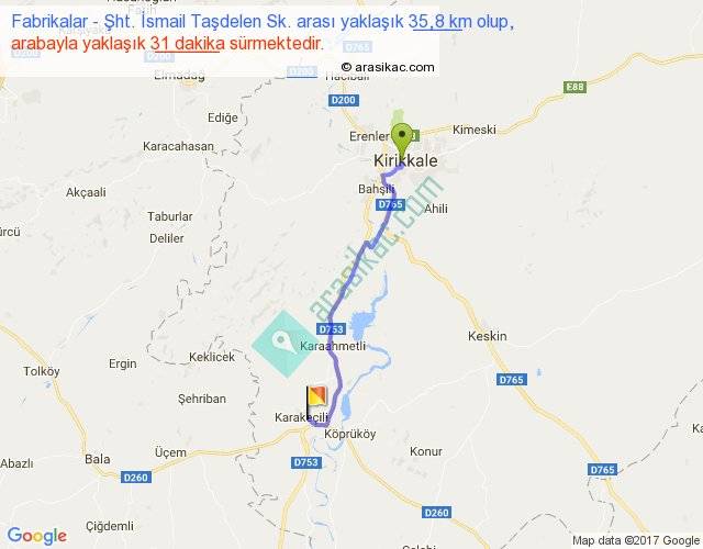 Fabrikalar - Şht. İsmail Taşdelen Sk. arası yaklaşık olarak 90 km/h ile yukarıda belirtilen sürede olup, iki yerin kuş uçuşu uzaklığı (mesafesi) 29'dir. Yolculuk otobüsle 40 dakika sürmektedir.