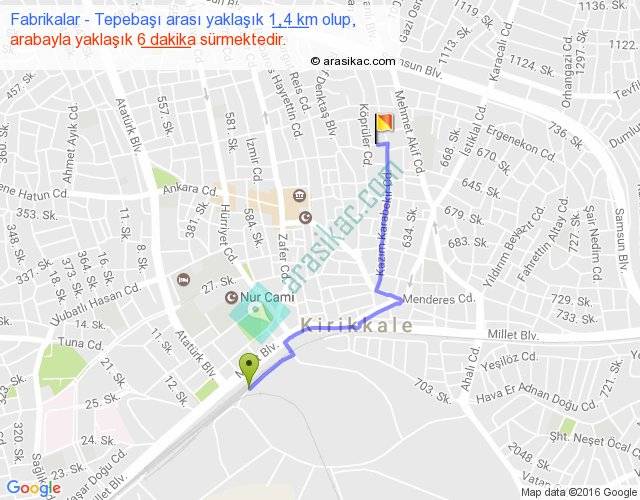 Fabrikalar - Tepebaşı arası yaklaşık olarak 90 km/h ile yukarıda belirtilen sürede olup, iki yerin kuş uçuşu uzaklığı (mesafesi) 1'dir. Yolculuk otobüsle 7 dakika sürmektedir.