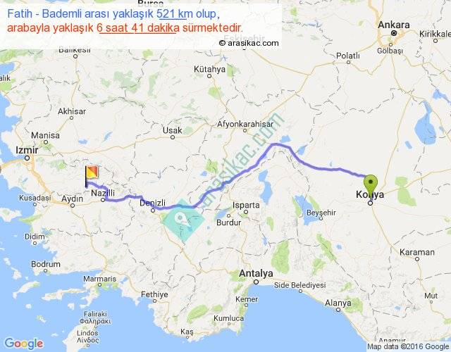 Fatih - Bademli arası yaklaşık olarak 90 km/h ile yukarıda belirtilen sürede olup, iki yerin kuş uçuşu uzaklığı (mesafesi) 387'dir. Eğer belirtilen yerler arasında uçak seferi var ise bu süre uçakla 35 dakika'ya kadar düşebilir. Yolculuk otobüsle 8 saat 41 dakika sürmektedir.