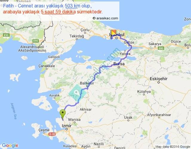 Fatih - Cennet arası yaklaşık olarak 90 km/h ile yukarıda belirtilen sürede olup, iki yerin kuş uçuşu uzaklığı (mesafesi) 296'dir. Eğer belirtilen yerler arasında uçak seferi var ise bu süre uçakla 27 dakika'ya kadar düşebilir. Yolculuk otobüsle 7 saat 46 dakika sürmektedir.