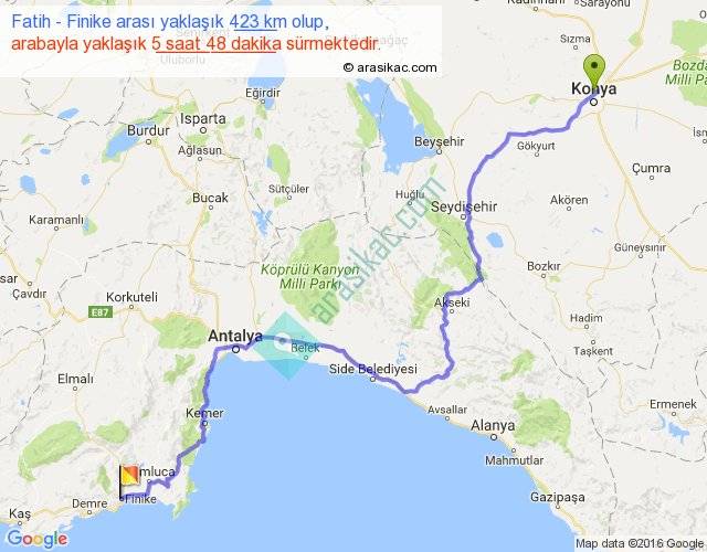 Fatih - Finike arası yaklaşık olarak 90 km/h ile yukarıda belirtilen sürede olup, iki yerin kuş uçuşu uzaklığı (mesafesi) 273'dir. Eğer belirtilen yerler arasında uçak seferi var ise bu süre uçakla 25 dakika'ya kadar düşebilir. Yolculuk otobüsle 7 saat 32 dakika sürmektedir.