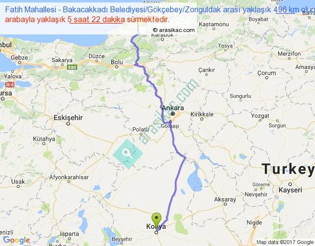 Fatih Mahallesi - Bakacakkadı Belediyesi Gökçebey Zonguldak arası yaklaşık olarak 90 km/h ile yukarıda belirtilen sürede olup, iki yerin kuş uçuşu uzaklığı (mesafesi) 380'dir. Eğer belirtilen yerler arasında uçak seferi var ise bu süre uçakla 35 dakika'ya kadar düşebilir. Yolculuk otobüsle 6 saat 58 dakika sürmektedir.