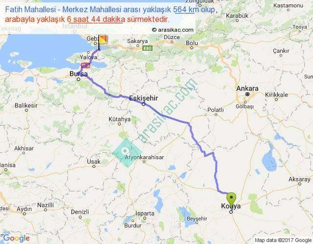Fatih Mahallesi - Merkez Mahallesi arası yaklaşık olarak 90 km/h ile yukarıda belirtilen sürede olup, iki yerin kuş uçuşu uzaklığı (mesafesi) 399'dir. Eğer belirtilen yerler arasında uçak seferi var ise bu süre uçakla 36 dakika'ya kadar düşebilir. Yolculuk otobüsle 8 saat 45 dakika sürmektedir.