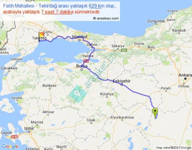 Fatih Mahallesi - Tekirdağ arası yaklaşık olarak 90 km/h ile yukarıda belirtilen sürede olup, iki yerin kuş uçuşu uzaklığı (mesafesi) 432'dir. Eğer belirtilen yerler arasında uçak seferi var ise bu süre uçakla 39 dakika'ya kadar düşebilir. Yolculuk otobüsle 9 saat 15 dakika sürmektedir.