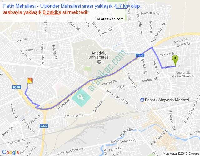 Fatih Mahallesi - Uluönder Mahallesi arası yaklaşık olarak 90 km/h ile yukarıda belirtilen sürede olup, iki yerin kuş uçuşu uzaklığı (mesafesi) 3'dir. Yolculuk otobüsle 10 dakika sürmektedir.