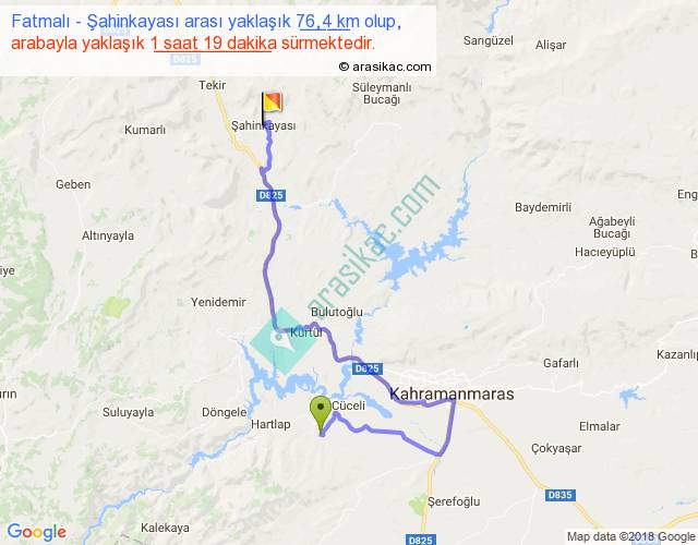 Fatmalı - Şahinkayası arası yaklaşık olarak 90 km/h ile yukarıda belirtilen sürede olup, iki yerin kuş uçuşu uzaklığı (mesafesi) 35'dir. Yolculuk otobüsle 1 saat 42 dakika sürmektedir.