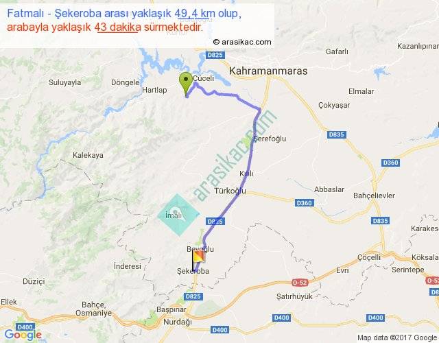 Fatmalı - Şekeroba arası yaklaşık olarak 90 km/h ile yukarıda belirtilen sürede olup, iki yerin kuş uçuşu uzaklığı (mesafesi) 31'dir. Yolculuk otobüsle 55 dakika sürmektedir.