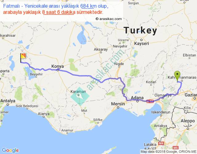 Fatmalı - Yenicekale arası yaklaşık olarak 90 km/h ile yukarıda belirtilen sürede olup, iki yerin kuş uçuşu uzaklığı (mesafesi) 491'dir. Eğer belirtilen yerler arasında uçak seferi var ise bu süre uçakla 45 dakika'ya kadar düşebilir. Yolculuk otobüsle 10 saat 31 dakika sürmektedir.