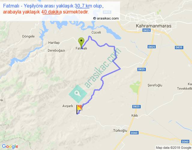 Fatmalı - Yeşilyöre arası yaklaşık olarak 90 km/h ile yukarıda belirtilen sürede olup, iki yerin kuş uçuşu uzaklığı (mesafesi) 13'dir. Yolculuk otobüsle 52 dakika sürmektedir.