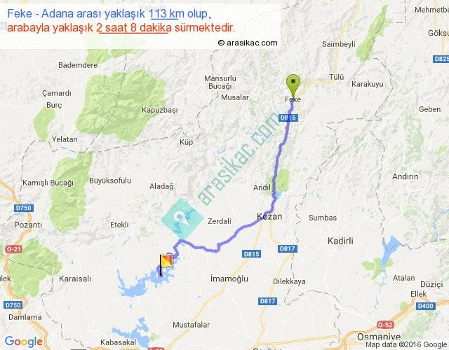 Feke - Adana arası yaklaşık olarak 90 km/h ile yukarıda belirtilen sürede olup, iki yerin kuş uçuşu uzaklığı (mesafesi) 76'dir. Yolculuk otobüsle 2 saat 46 dakika sürmektedir.