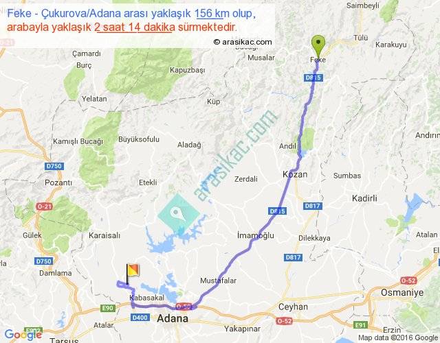 Feke - Çukurova Adana arası yaklaşık olarak 90 km/h ile yukarıda belirtilen sürede olup, iki yerin kuş uçuşu uzaklığı (mesafesi) 103'dir. Yolculuk otobüsle 2 saat 54 dakika sürmektedir.
