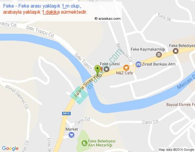 Feke - Feke arası yaklaşık olarak 90 km/h ile yukarıda belirtilen sürede olup, iki yerin kuş uçuşu uzaklığı (mesafesi) 0'dir. Yolculuk otobüsle 1 dakika sürmektedir.