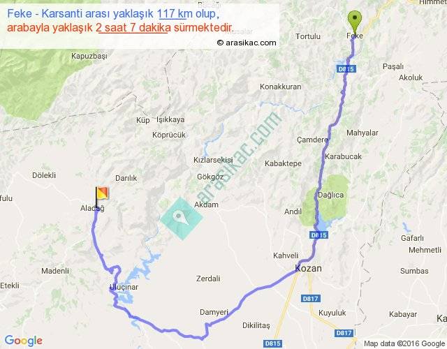 Feke - Karsanti arası yaklaşık olarak 90 km/h ile yukarıda belirtilen sürede olup, iki yerin kuş uçuşu uzaklığı (mesafesi) 53'dir. Yolculuk otobüsle 2 saat 45 dakika sürmektedir.