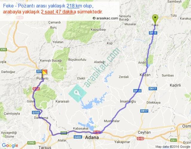 Feke - Pozantı arası yaklaşık olarak 90 km/h ile yukarıda belirtilen sürede olup, iki yerin kuş uçuşu uzaklığı (mesafesi) 100'dir. Yolculuk otobüsle 3 saat 37 dakika sürmektedir.