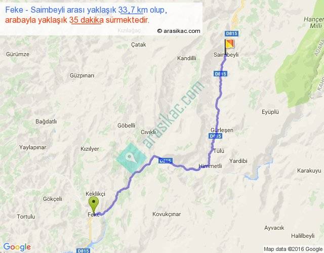 Feke - Saimbeyli arası yaklaşık olarak 90 km/h ile yukarıda belirtilen sürede olup, iki yerin kuş uçuşu uzaklığı (mesafesi) 25'dir. Yolculuk otobüsle 45 dakika sürmektedir.