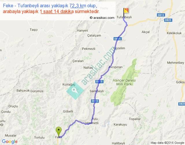 Feke - Tufanbeyli arası yaklaşık olarak 90 km/h ile yukarıda belirtilen sürede olup, iki yerin kuş uçuşu uzaklığı (mesafesi) 56'dir. Yolculuk otobüsle 1 saat 36 dakika sürmektedir.