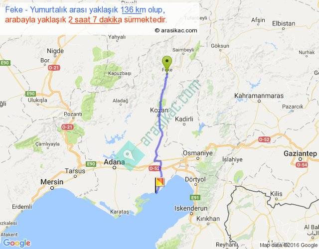 Feke - Yumurtalık arası yaklaşık olarak 90 km/h ile yukarıda belirtilen sürede olup, iki yerin kuş uçuşu uzaklığı (mesafesi) 116'dir. Yolculuk otobüsle 2 saat 45 dakika sürmektedir.