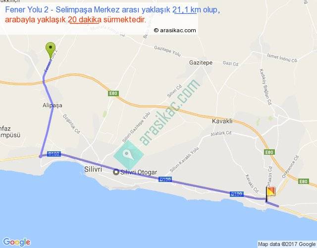 Fener Yolu 2 - Selimpaşa Merkez arası yaklaşık olarak 90 km/h ile yukarıda belirtilen sürede olup, iki yerin kuş uçuşu uzaklığı (mesafesi) 15'dir. Yolculuk otobüsle 26 dakika sürmektedir.