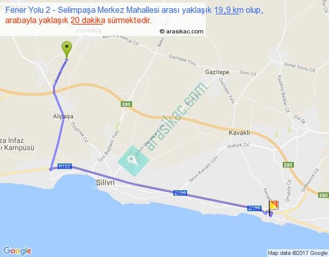 Fener Yolu 2 - Selimpaşa Merkez Mahallesi arası yaklaşık olarak 90 km/h ile yukarıda belirtilen sürede olup, iki yerin kuş uçuşu uzaklığı (mesafesi) 14'dir. Yolculuk otobüsle 26 dakika sürmektedir.