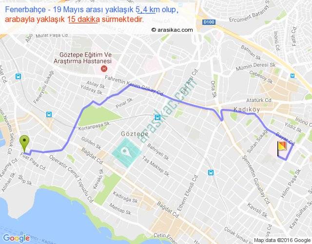 Fenerbahçe - 19 Mayıs arası yaklaşık olarak 90 km/h ile yukarıda belirtilen sürede olup, iki yerin kuş uçuşu uzaklığı (mesafesi) 4'dir. Yolculuk otobüsle 19 dakika sürmektedir.