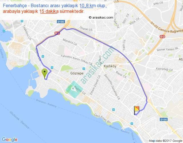 Fenerbahçe - Bostancı arası yaklaşık olarak 90 km/h ile yukarıda belirtilen sürede olup, iki yerin kuş uçuşu uzaklığı (mesafesi) 5'dir. Yolculuk otobüsle 19 dakika sürmektedir.
